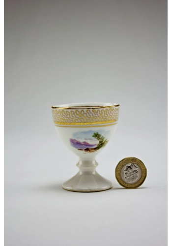 A small high quality porcelain egg cup decorated with a band of vermiculated gilding and two small landscapes, one which is clearly visible, the other which is a little obscure.