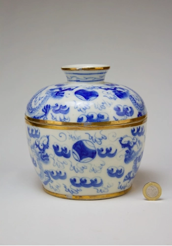 A charming and useful lidded vessel decorated with loosely painted and comical Chinese dragons with pearls and banded with brass rings.
