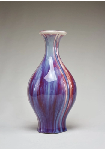 A Contemporary Chinese flambe glazed trefoil vase. Such trefoil vases were made during the Qing dynasty but are rare. This vase has drawn from the rich history of Chinese ceramics, taking a complex rare shape from its past and a red and blue flambe glaze which is forming a wonderful fur like texture.