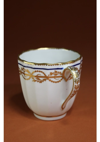 A lovely restrained Georgian pattern on a fine body with 16 facets. Top quality gilding to the handle and a band of gilding around the foot, and dentil gilding around the rim. A dark blue onglaze line below the rim and a gilded pattern below that. A gilded bunch of flowers in the bowl of the cup, which shows some wear otherwise over all in excellent condition.