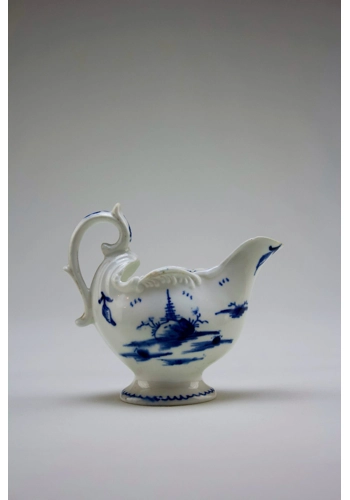 Derby porcelain shell form cream boat decorated in a rich deep saphire blue cobalt with the “House on an island” pattern.