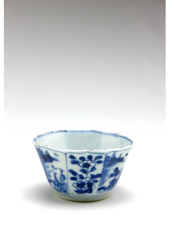 A lovely octagonal cup decorated in underglaze cobalt blue with alternating panels of landscapes and flower motifs around the outside and a landscape on the inside.