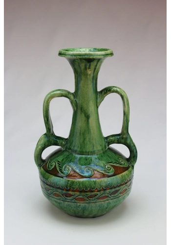 The vase is thrown in a red earthenware clay and then covered in a white slip. The slip is then cut back ‘sgraffito’ to reveal the darker clay and create the decorative pattern. The whole vase has then been covered in a thin copper green glaze.