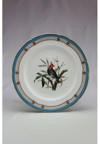 Hand painted with an exotic red crested bird. The detail of the border is very high quality as is the painting of the bird.