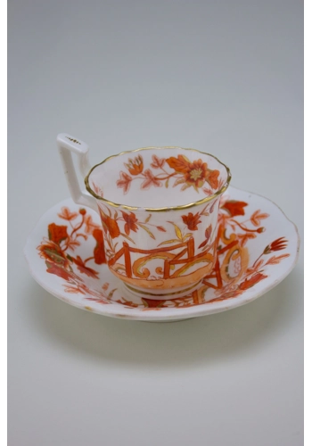 An unusual and wonderfully busy imari influenced coffee cup and saucer, handpainted in orange red and gold.