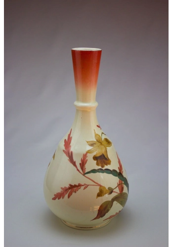 An unusual hand painted vase with daffodils and leaves, outlined with fine gilt lines. Of European manufacture the body has been cast in a mould, the top sprayed in a madder colour with a fine fade.
