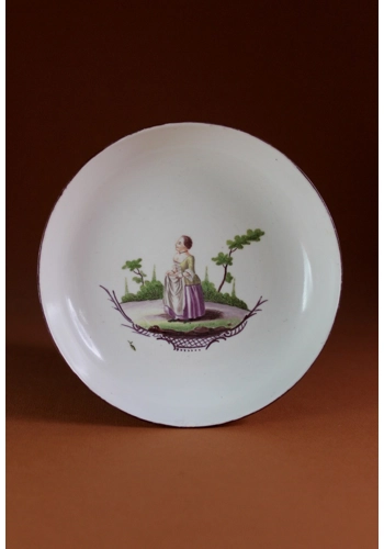 A very rare piece of porcelain made at the Weesp facory somewhere between 1760 and 1768. The paste has a very creamy warm colour unlike some of the German hard paste, and the glaze has a softness. It is delicately decorated with a woman holding her skirts up as she walks in the garden. Some hedges bushes and trees in the background, the whole scene framed at the bottom by a latice.