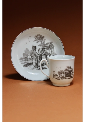 Worcester Coffee Cup and Saucer Printed with "Milkmaids" Pattern 1765